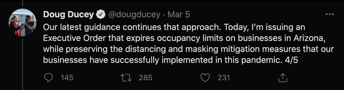 Three days ago the governor of my home state, Arizona, made the call to re-open businesses back to 100% capacity with the expectation that social distancing and face coverings are still required.